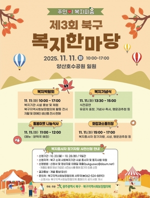 [빛가람뉴스=이종화 기자] 광주 북구는 오는 11일 양산호수공원에서 ‘복지한마당’ 행사를 연다고 10일 밝혔다.‘주민이 복지 피움’을 주제로 마련된 이번 행사에는 복지시설 종사자, 지역사회보장협의체 위원, 지역 주민 등 약 700명이 참여한다. 참석자들은 상호 노고를 격려하고 복지사업의 성과를 함께 나눌 예정이다.올해로 3회를 맞이한 ‘복지한마당’은 북구 지역사회보장협의체가 주관하며 복지 박람회, 나눔식사, 기념식, 화합과 소통의 장 등 다양한 프로그램으로 구성된다. 복지 박람회에서는 복지시설과 공공기관 등 48개 부스가 운영돼,
