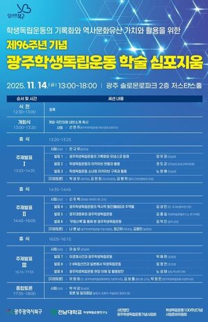 [빛가람뉴스=이종화 기자] 광주 북구가 오는 14일 광주 솔로몬로파크 저스티스홀에서 ‘학생독립운동 96주년 기념 학술 심포지엄’을 개최한다고 13일 밝혔다.심포지엄은 ‘학생독립운동의 기록화 및 역사문화유산의 가치와 활용’이라는 주제로 ‘학생독립운동’의 역사적 의미를 재조명하고 문화유산 활용 방안을 모색하기 위해 마련됐다.‘학생독립운동’은 1929년 11월 3일 광주에서 시작해 전국으로 확산된 항일 시위운동으로 당시 전국 320여 개가 넘는 학교에서 54,000여명 이상의 학생이 참여해 3·1운동 이후 최대 규모의 항일운동으로 평가받
