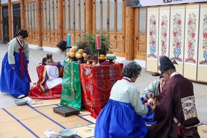 [빛가람뉴스=정영곤 기자] 영암목재문화체험장에서 ‘2025 대한민국 한옥문화 비엔날레’의 일환으로 전통혼례가 진행됐다.이날 전통혼례는 영암군민 김정희씨와 쩐티미린씨가 혼례를 올리며 실제 부부가 된 행사로, 약혼 10년 만에 정식 결혼식을 올리는 감동을 더했다.비엔날레를 찾은 참가자들은 월출산 아래 한옥을 배경으로 열린 혼례 현장에서 자녀, 친척, 마을 주민, 관광객 등과 함께 두 사람의 결혼을 축하했다.행사는 풍물패의 길터주기로 시작해, 백마를 탄 신랑과 꽃가마를 탄 신부 입장으로 분위기가 무르익었다. 이어 김숙희 명창이 사랑가를